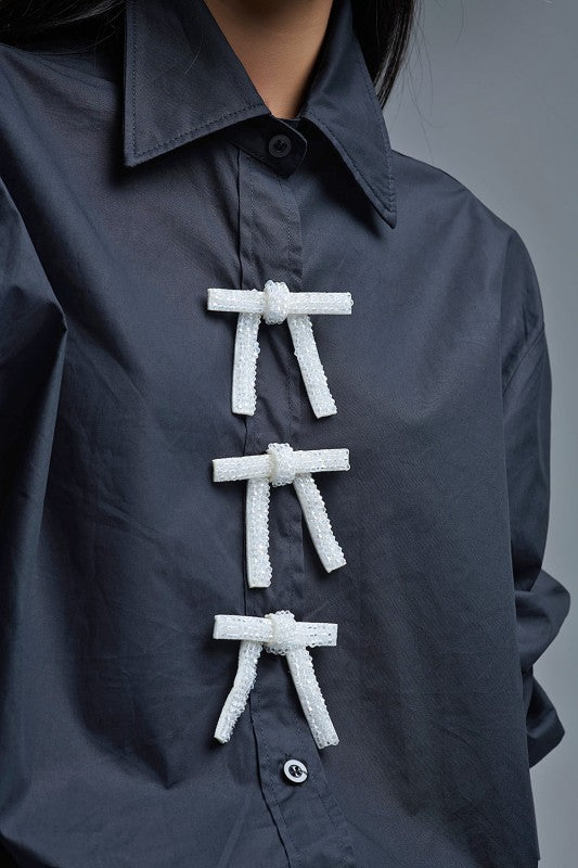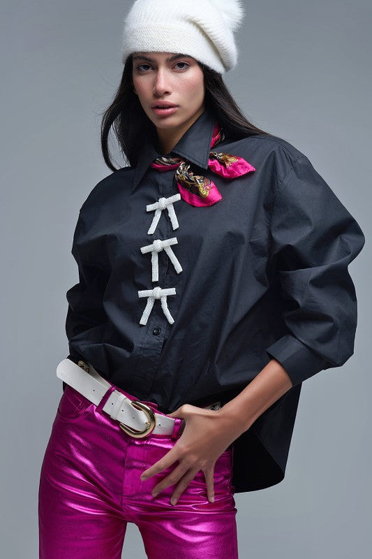 Step up your style game with our oversized black poplin shirt, featuring a playful white beaded bow-button that steals the show. Made from smooth poplin fabric, it sports a classy polo collar and trendy 3/4 sleeves for that effortlessly chic vibe. The roomy fit ensures all-day comfort, while the delicate beadwork adds a fun, flirty touch. Perfect for mixing and matching—from casual days at work to dressy nights out, this shirt is your new go-to wardrobe hero. Model wears size S, standing tall at 5'9" with measurements 33-24-35.