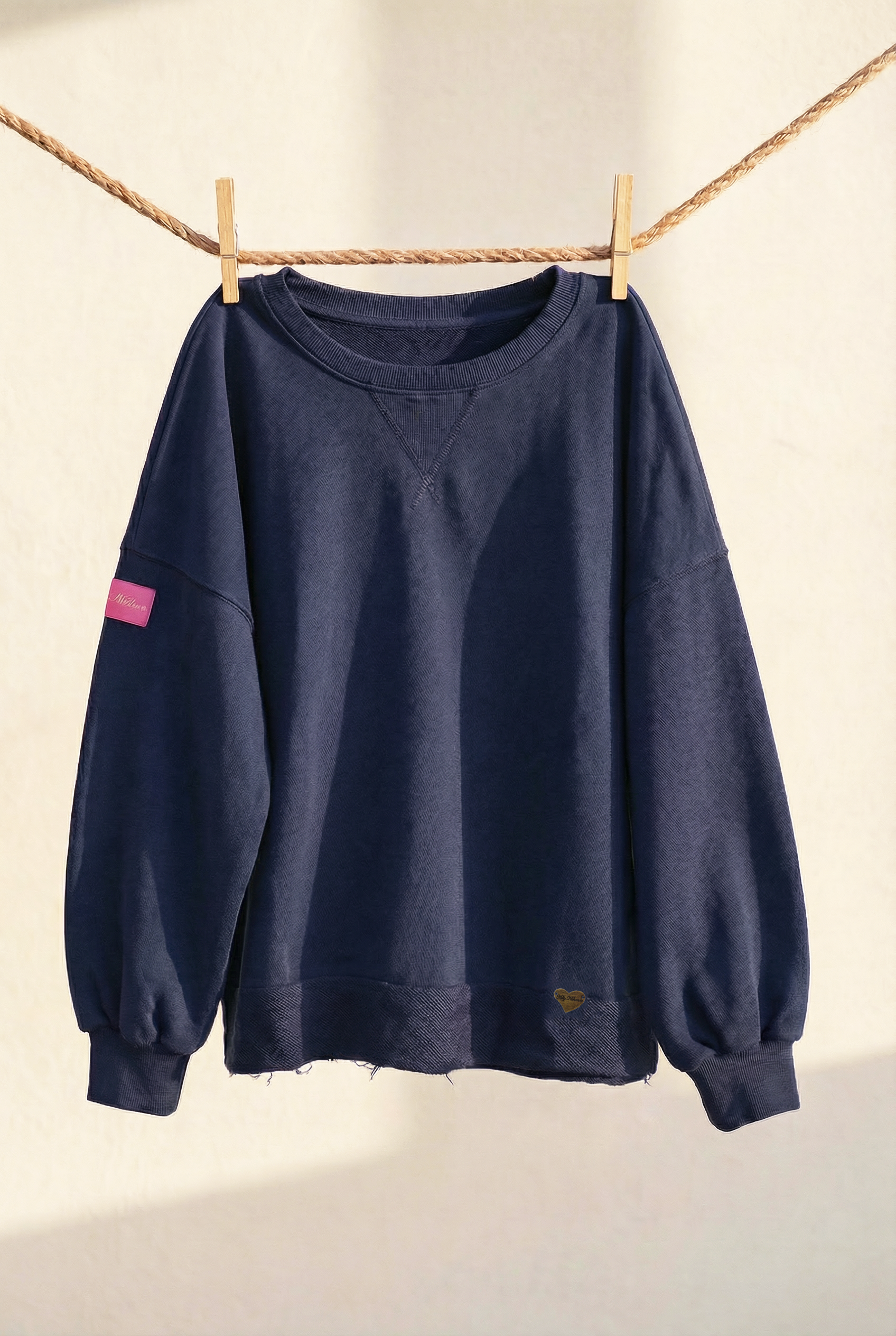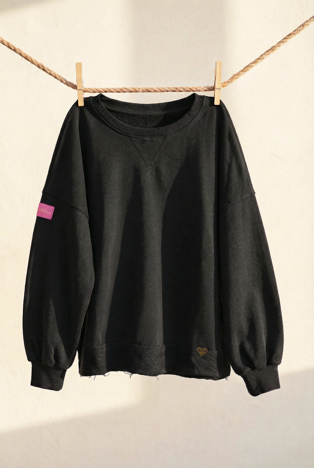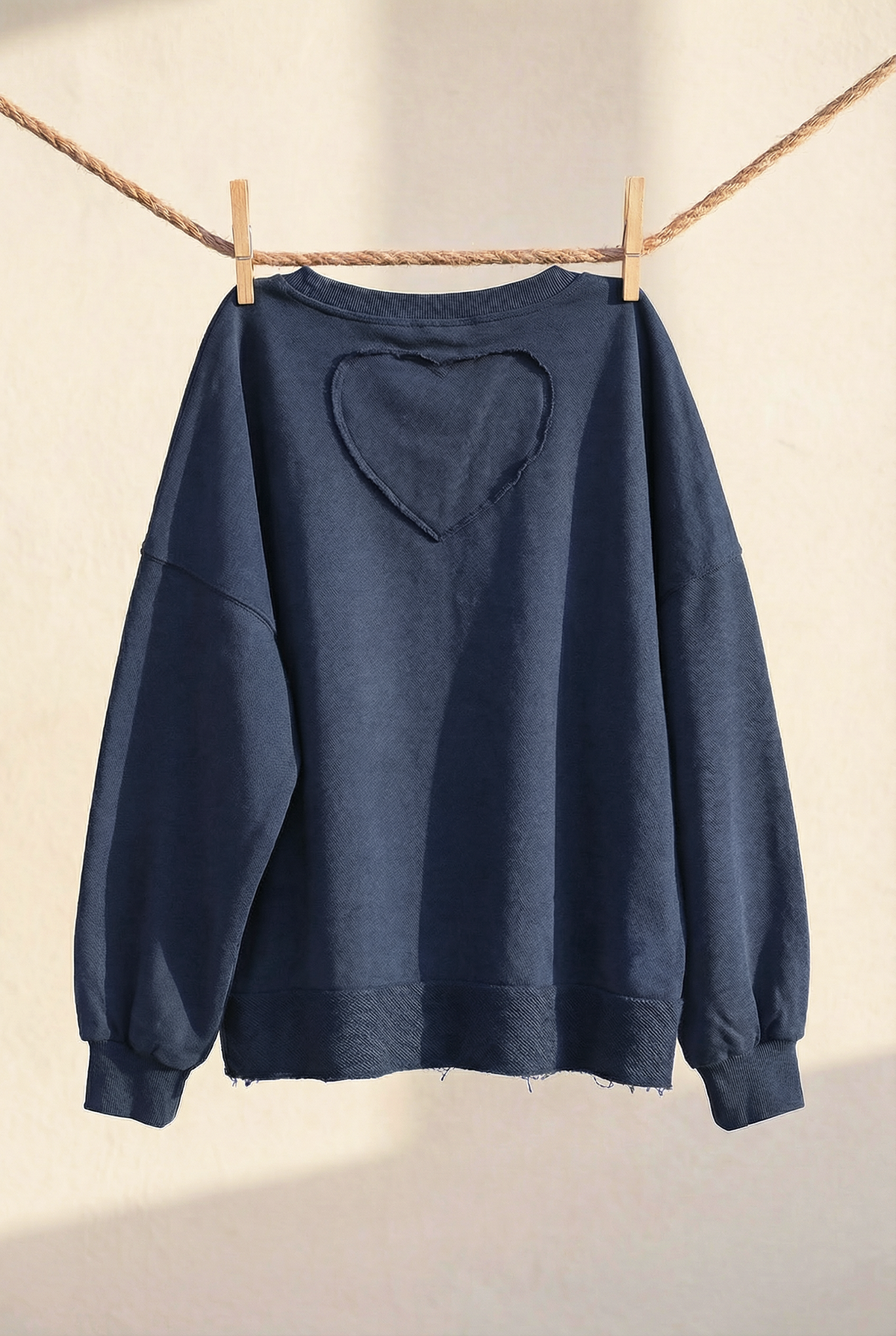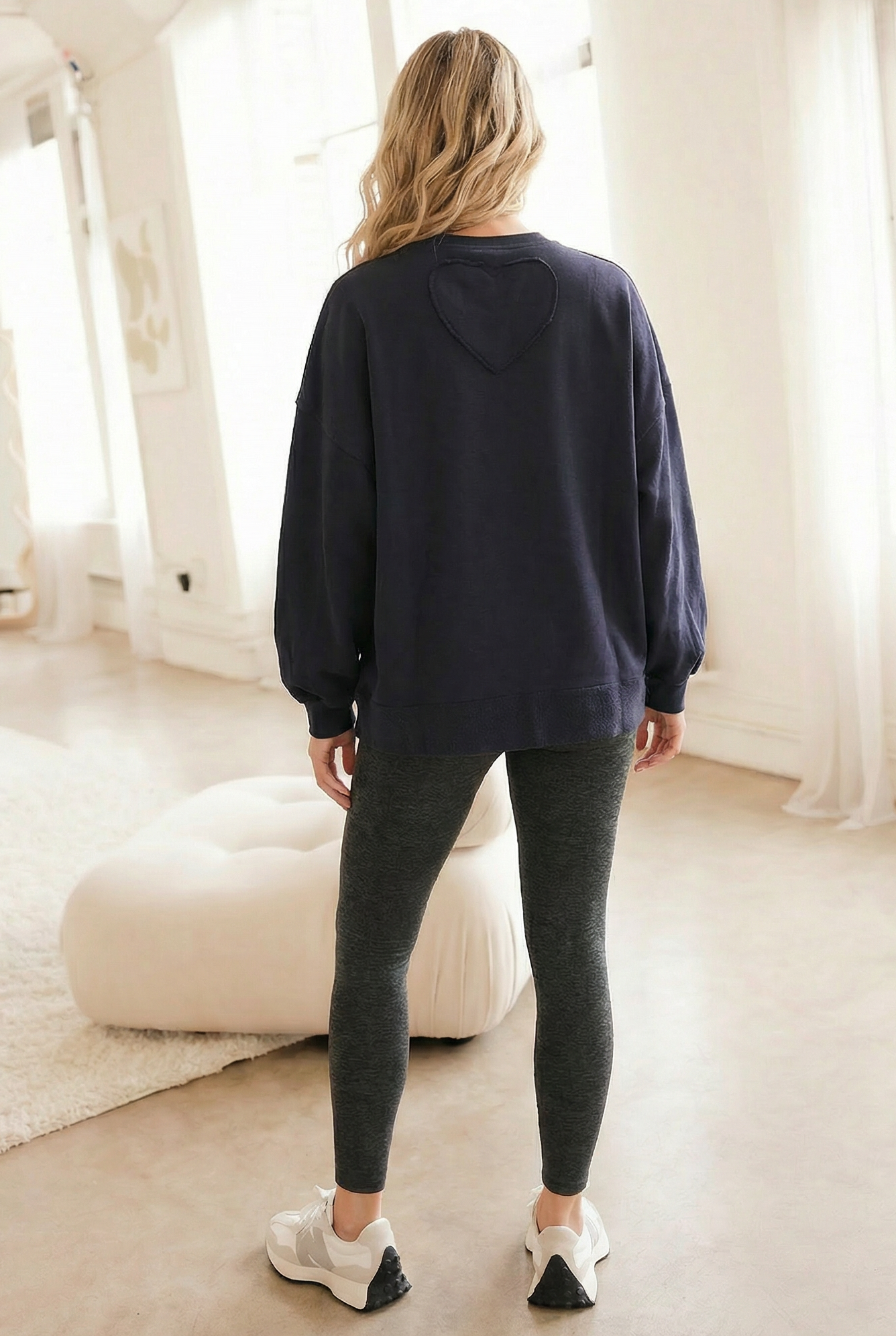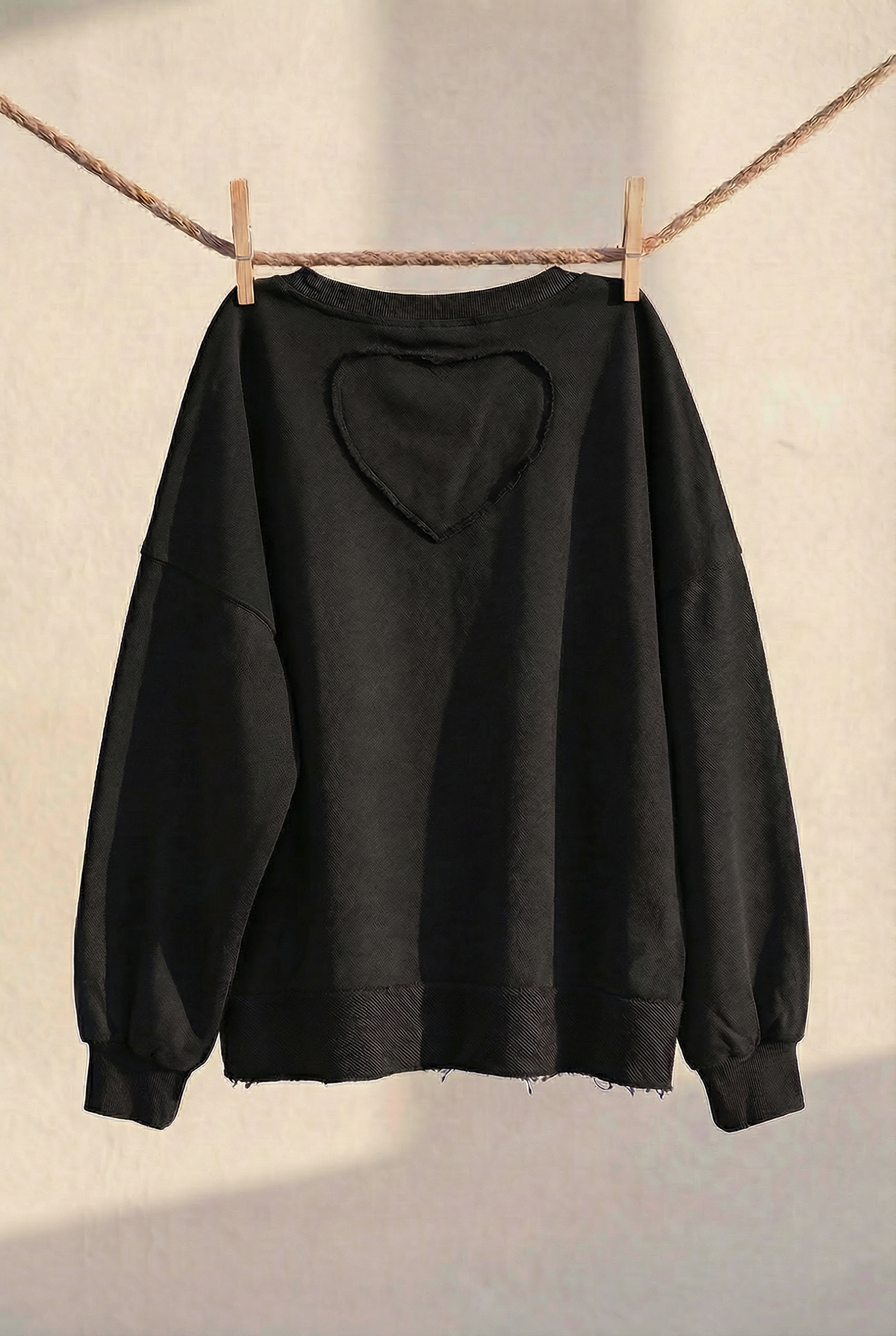 Wrap yourself in cozy comfort with this oversized French terry sweatshirt that's equal parts adorable and effortlessly chic. The deconstructed heart adorning the back tells a story, while an antique brass heart plate on the front adds a touch of vintage charm. A vibrant Kelly Nishimoto tag on the sleeve brings that perfect pop of personality. Perfect for lounging, running errands, or making a subtle style statementāthis piece proves that comfort never goes out of style.