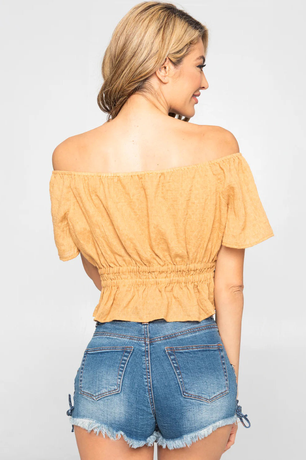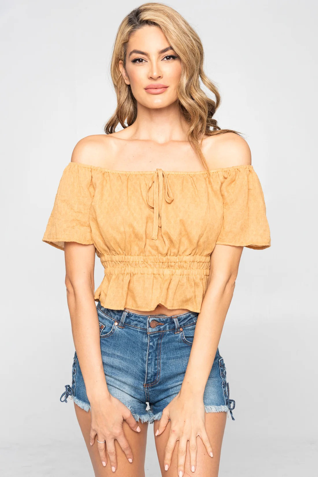 Turn up the charm with this mustard yellow off-shoulder crop top that’s equal parts flirty and fun. Designed with a ruffled hem and a comfy smocked waist, it hugs just right while giving you that effortless boho vibe. The lightweight fabric keeps it breezy, while the playful tie-front detail adds a sweet touch.